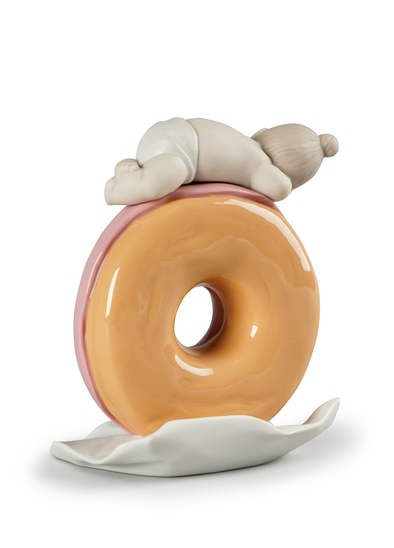 A piece mixing glazed and matte porcelain, decorated with intense tones meticulously applied by hand. A creation that combines tenderness with humor, making it an ideal gift for a newborn baby as it can be personalized in the space available for this purpose on the base. Handcrafted in Spain. 5" in height.