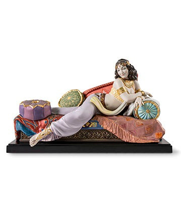 Among the many stories that have come down to us over the course of time, from all different periods and from all different cultures, there are few as fascinating and charming as the tales told by the resourceful Princess Scheherazade to King Shahriar during the legendary Thousand and One Nights. This portrayal of an unsurpassed narrator is a tribute to the art of storytelling and the pleasure of listening, especially when the stories transport us to the magical world of oriental legends. Princess Scheherazade has everything you could expect from the main character of a timeless myth: the fascinating beauty of a woman able to seduce a legendary king, coupled with the opulent luxury of the Orient. The princess’s body, delicately modelled, is depicted reclining among brightly-colored fabrics and cushions and finely outlined rich ornamentation. The details in golden luster add a further touch of wealth and vibrancy to the overall composition. A scene conjured in the imagination of true romantic artists who have also envisaged the Orient shrouded in mystery and sensuality. Here the magic of the Thousand and One Nights is turned into a fantasy in porcelain able to make us dream.