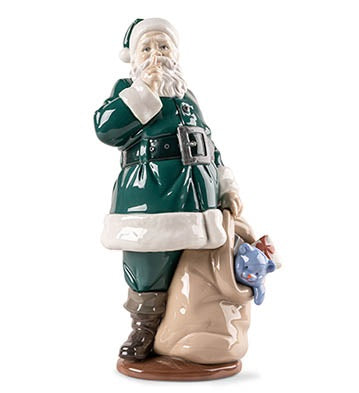 This Santa Claus in glazed porcelain asks us to keep his secret while he delivers his gifts. This creation stands out for its expressiveness, charm and richness of details, ranging from his distinctive clothing to the sack overflowing with toys for children. Santa’s costume is decorated in deep green, one of the most popular colors of the holiday season. 13" in height.
